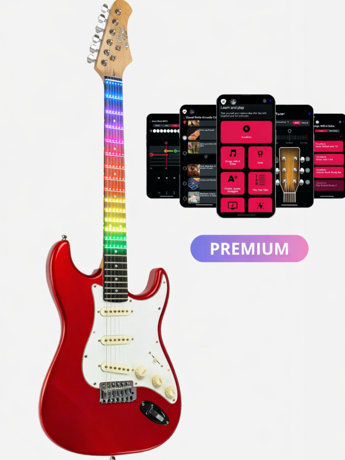 The bundle includes an Eko ST-300 electric guitar with the Visual Note Music Learning Device already installed and the Premium subscription included to start learning to play right away using all the magic of the Visual Note system.