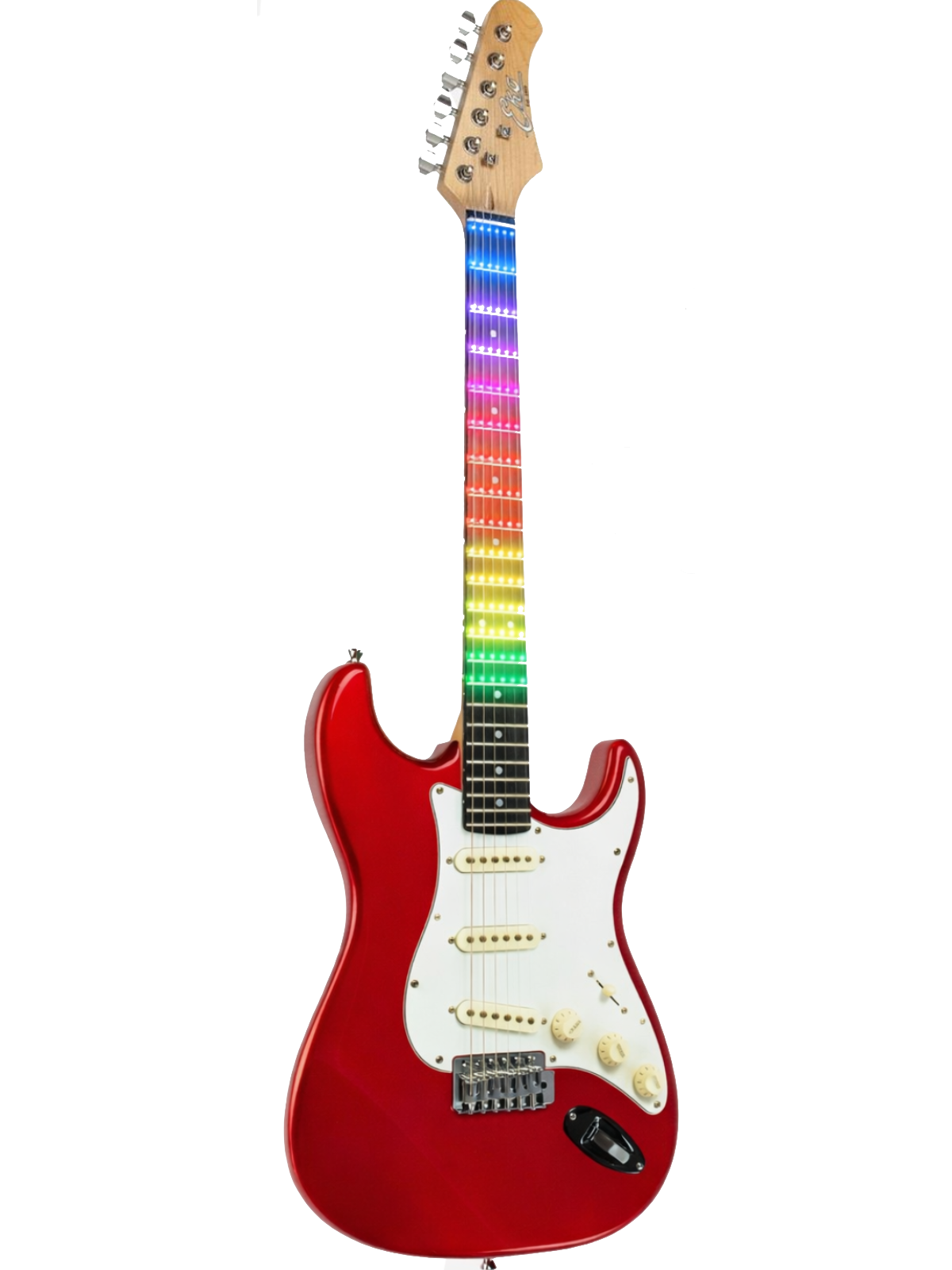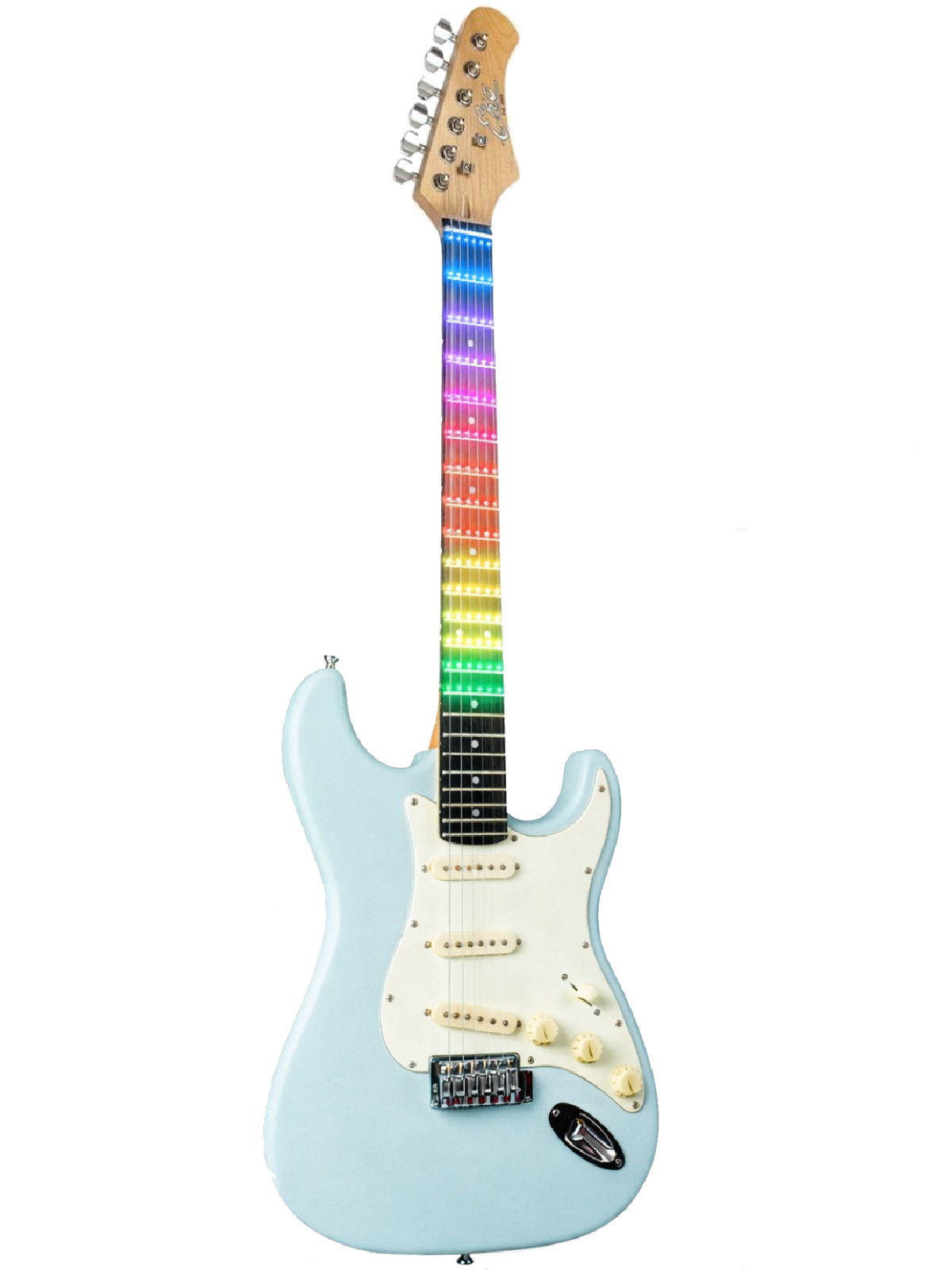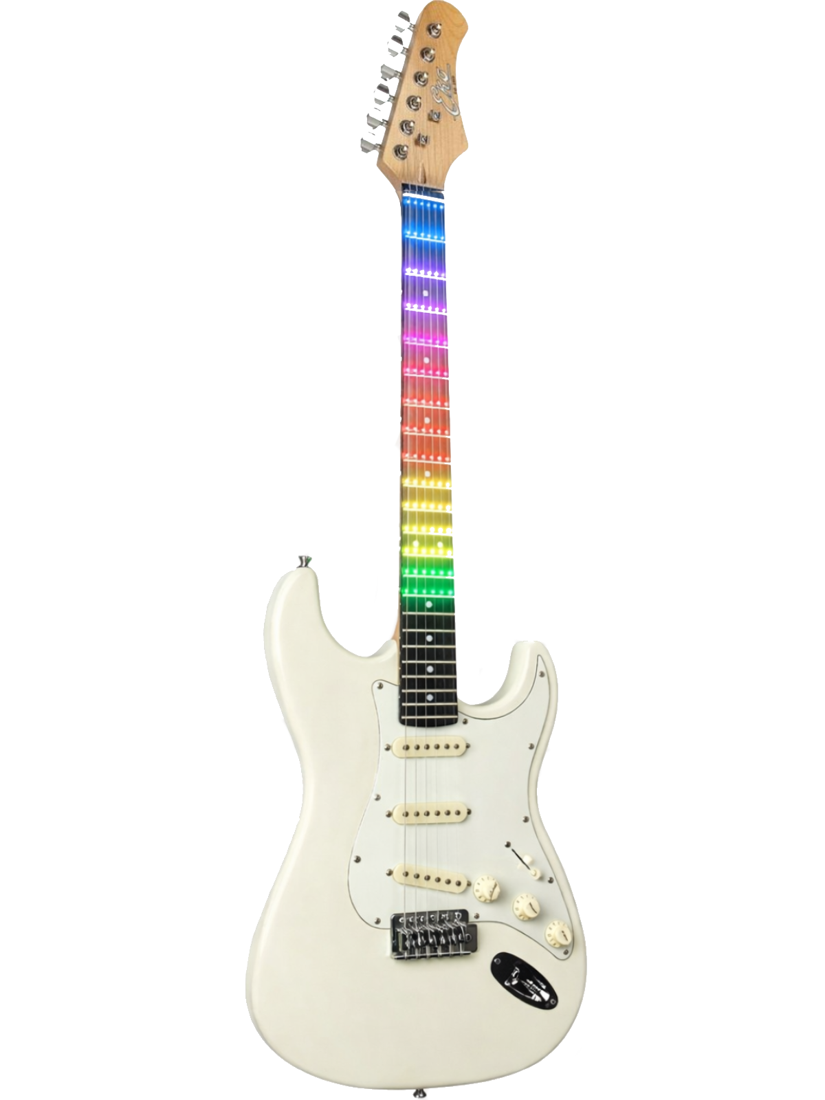 This bundle includes an Eko ST-300 electric guitar with the Visual Note learning system already integrated.